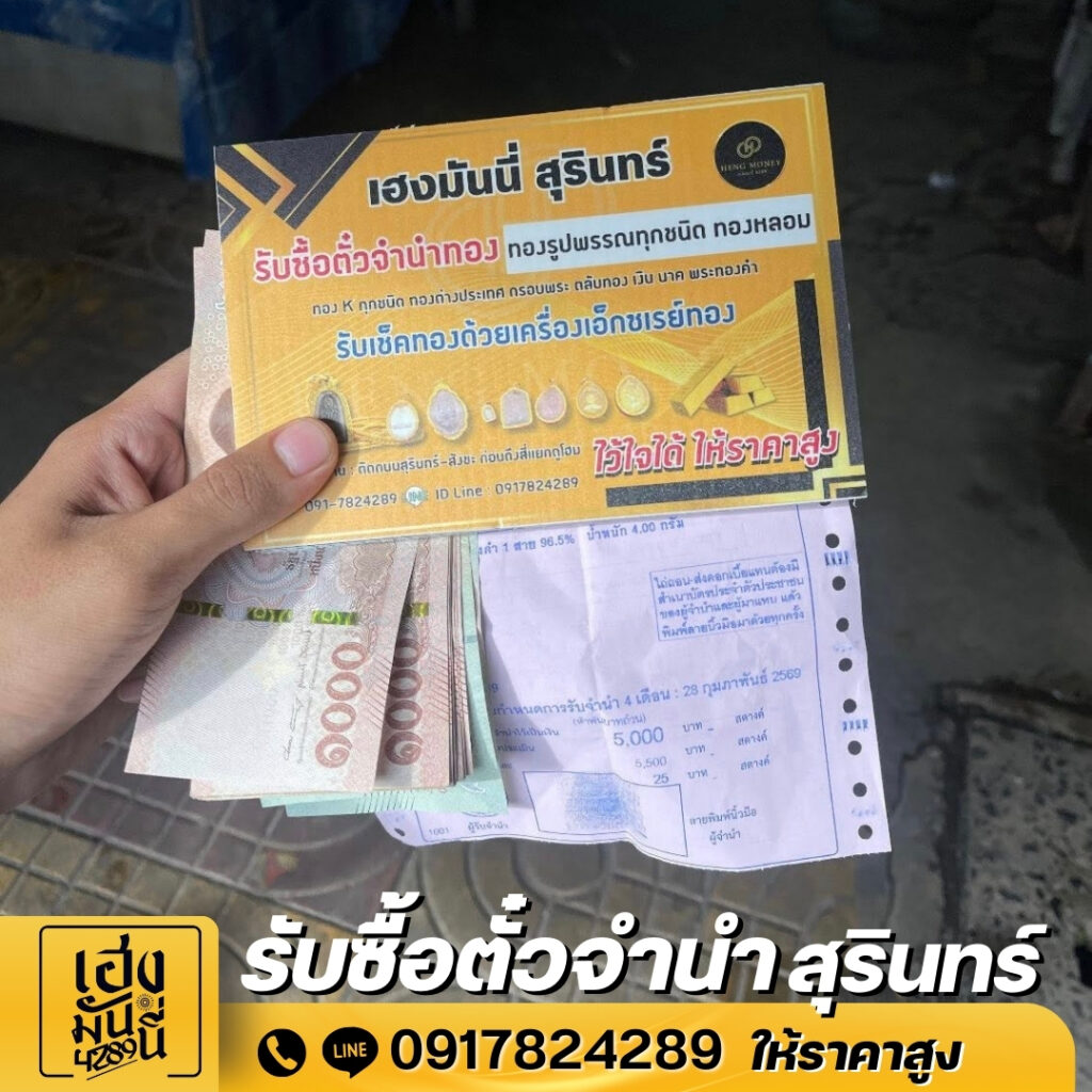 สำหรับผู้ที่ไม่สะดวกดำเนินการเอง เฮงมันนี่ สุรินทร์ ให้บริการรับซื้อตั๋วจำนำอย่างตรงไปตรงมา ประเมินตามยอดจริง แจ้งรายละเอียดครบถ้วนก่อนตกลง และจ่ายเงินสดทันที เพื่อให้คุณตัดสินใจได้อย่างสบายใจและได้รับประโยชน์สูงสุดจากตั๋วจำนำของคุณ